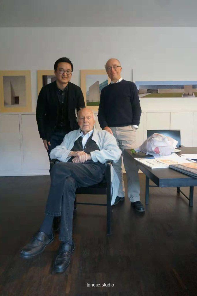 A photo of Tang Jie with Gottfried Böhm, the 1986 Pritzker Prize laureate, and his son Paul Böhm.