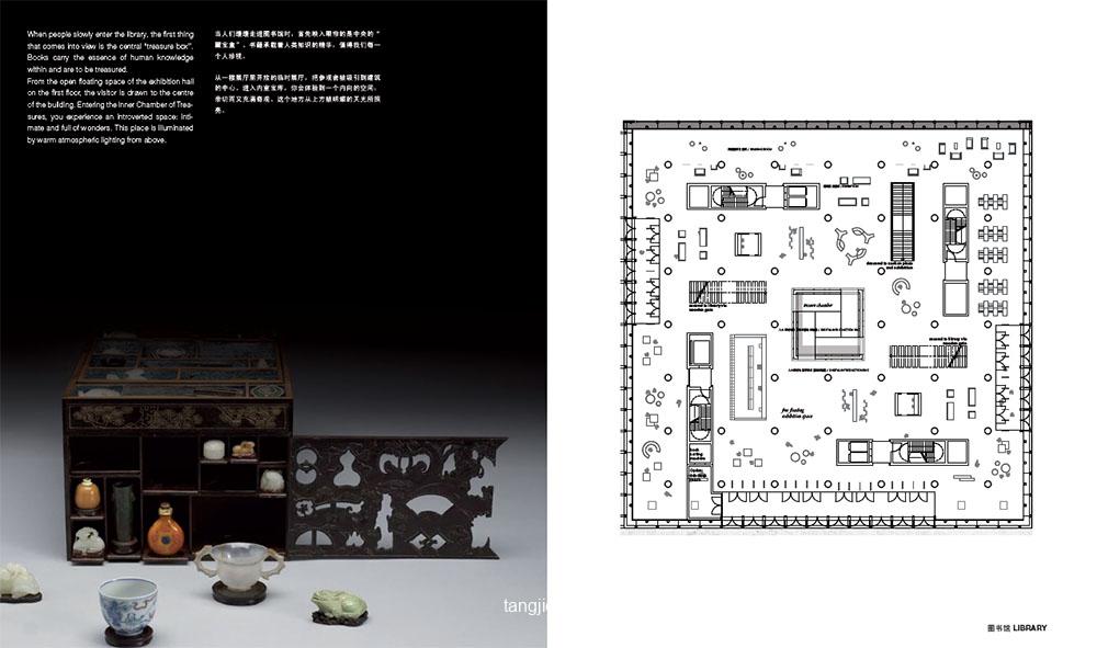 建筑位于校园中轴线的核心位置,是新校区最重要的地标与公共空间。设计以木构体系为主,空间层层递进:从下沉广场与全天候开放的学习空间,到中庭环绕的古籍阅览室,再到顶部三层通高的阅读大厅,营造出如同森林般的氛围。透明的立面与天窗将自然光引入室内,使内外在视觉与体验上自然融合。